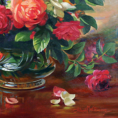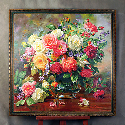 Оформление картины с современным цветочным натюрмортом в деревянном испанском багете с ручным золочением