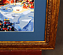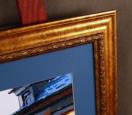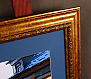 Оформление постера-картины в деревянный золотой багет с синим паспарту под стеклом