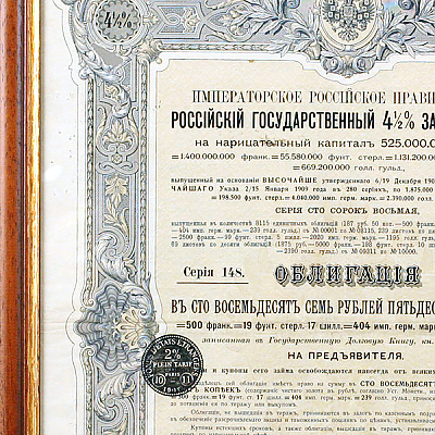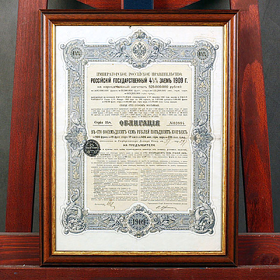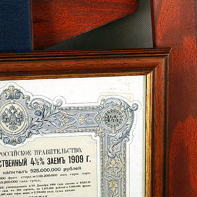 Оформление документа облигации займа Москвы в деревянную итальянскую багетную раму